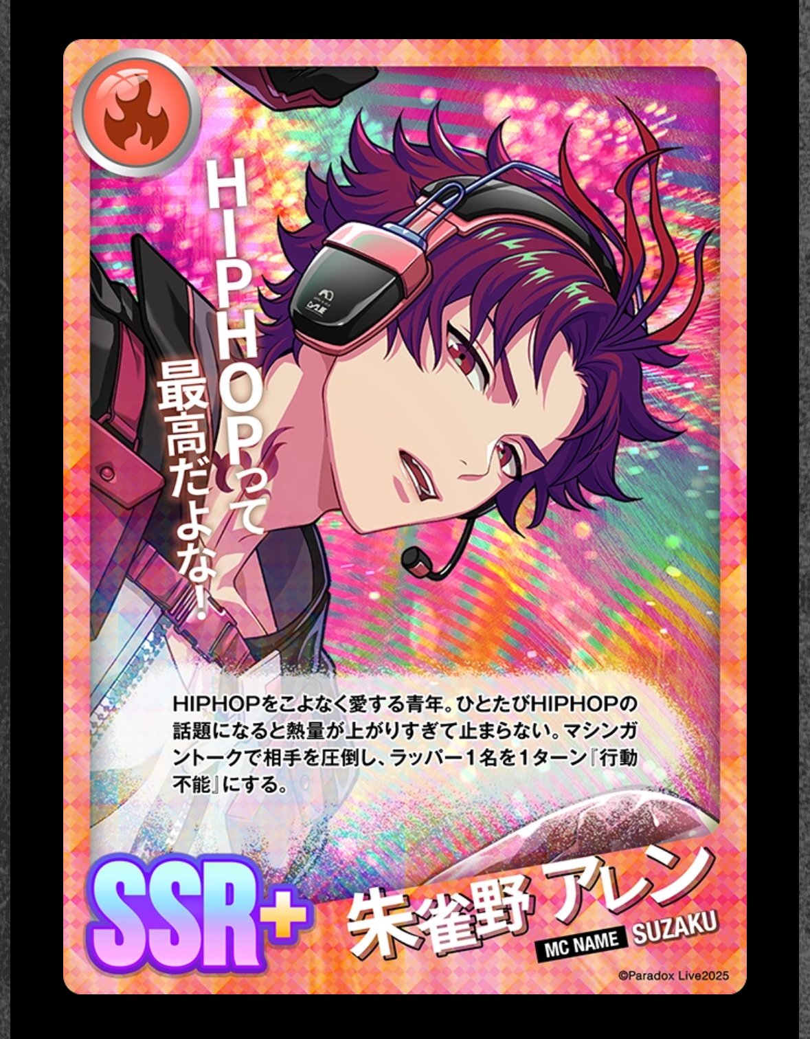 HIPHOP을 각별히 사랑하는 청년. 일단 HIPHOP의 화제가 나오면 열량이 너무 올라가 멈추지 않는다. 머신건 토크로 상대를 압도해, 래퍼 1명을 1턴 「행동 불능」으로 만든다.