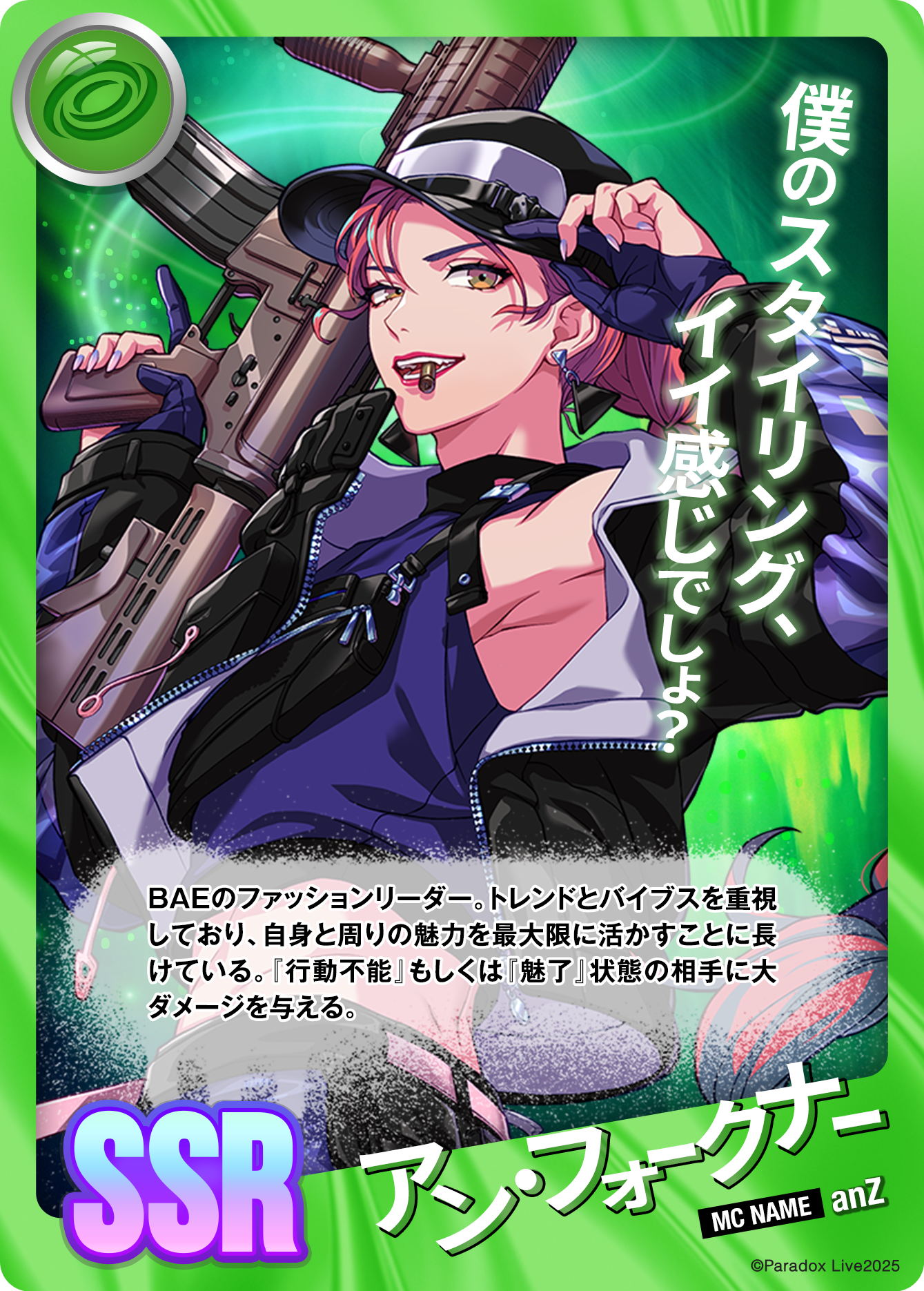 BAE의 패션 리더. 트렌드와 바이브스를 중시하고 있으며, 자신과 주변의 매력을 최대한 살리는 데에 능하다. 「행동 불능」 혹은 「매료」 상태의 상대에게 큰 데미지를 준다.