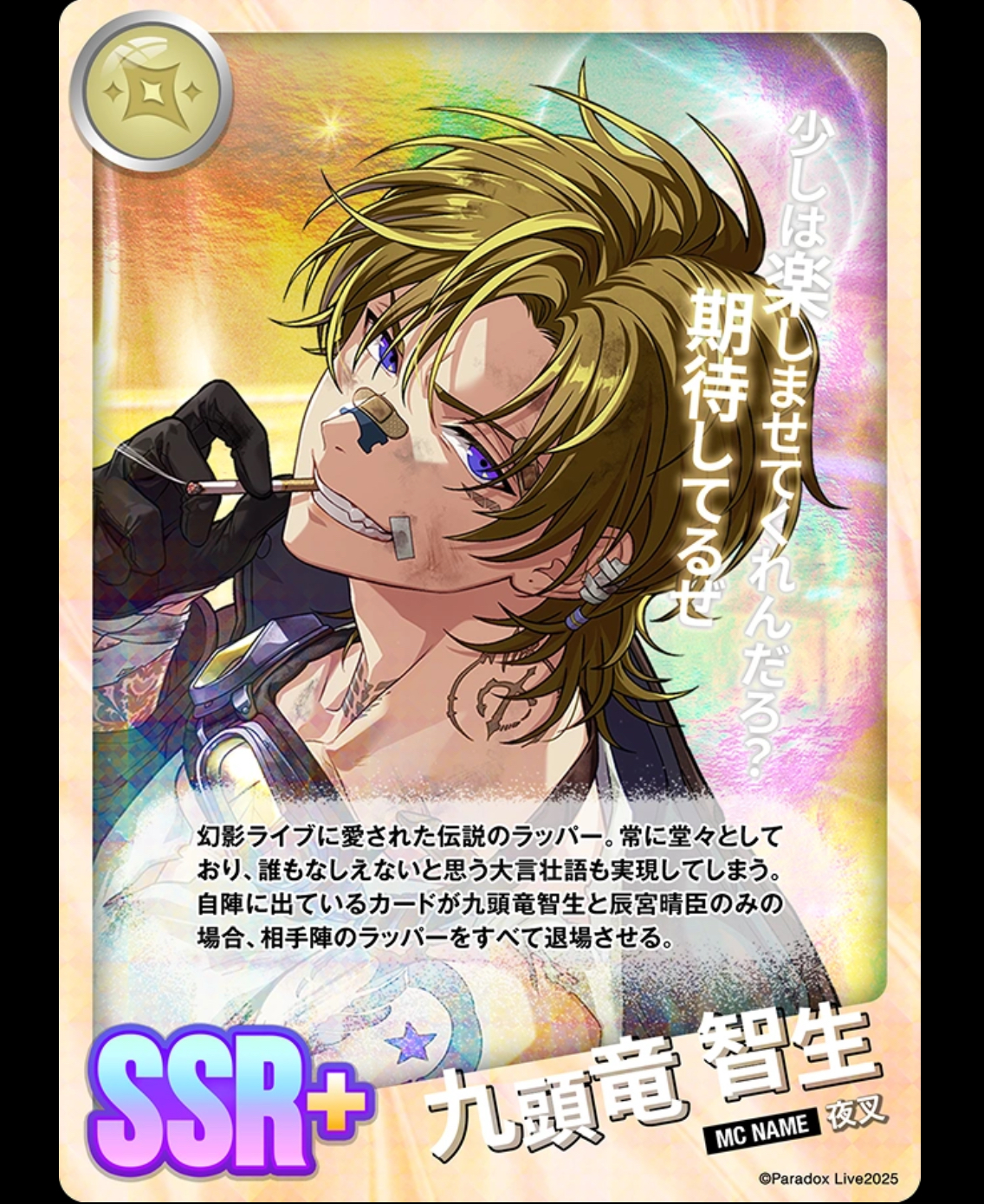 환영 라이브의 사랑을 받은 전설의 래퍼. 항상 당당하고, 누구도 할 수 없다고 생각하는 호언장담도 실현시키고 만다. 자기 진영에 나와 있는 카드가 쿠즈류 치세이와 신구 하루오미 뿐인 경우, 상대 진영의 래퍼를 모두 퇴장시킨다.
