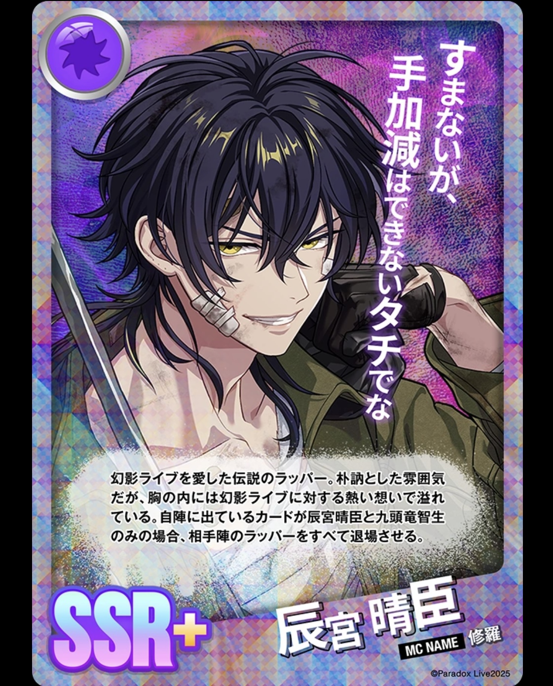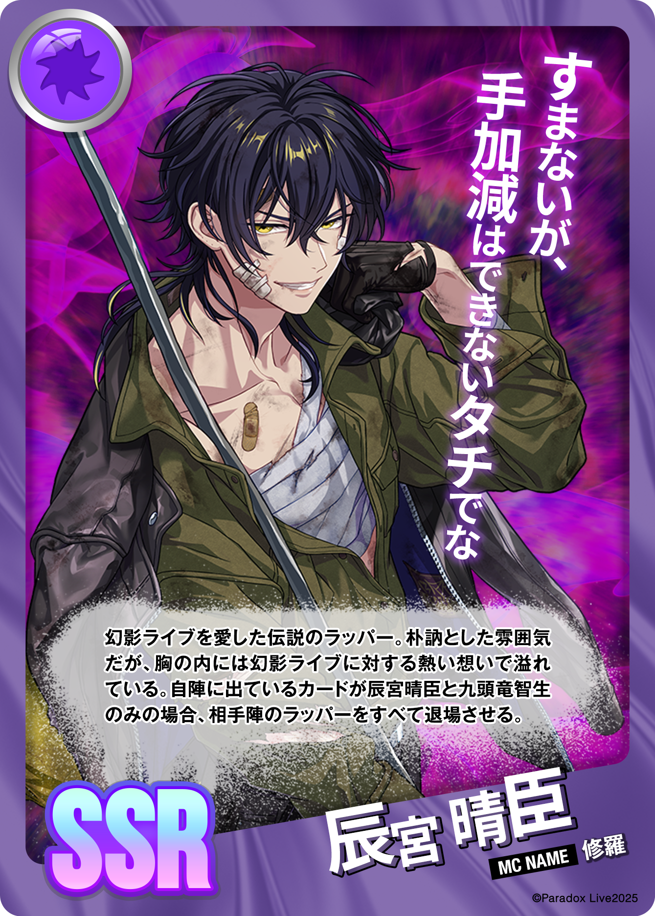 환영 라이브를 사랑한 전설의 래퍼. 과묵한 분위기지만, 가슴속엔 환영 라이브에 대한 뜨거운 마음이 넘치고 있다. 자기 진영에 나와 있는 카드가 신구 하루오미와 쿠즈류 치세이 뿐인 경우, 상대 진영의 래퍼를 모두 퇴장시킨다.