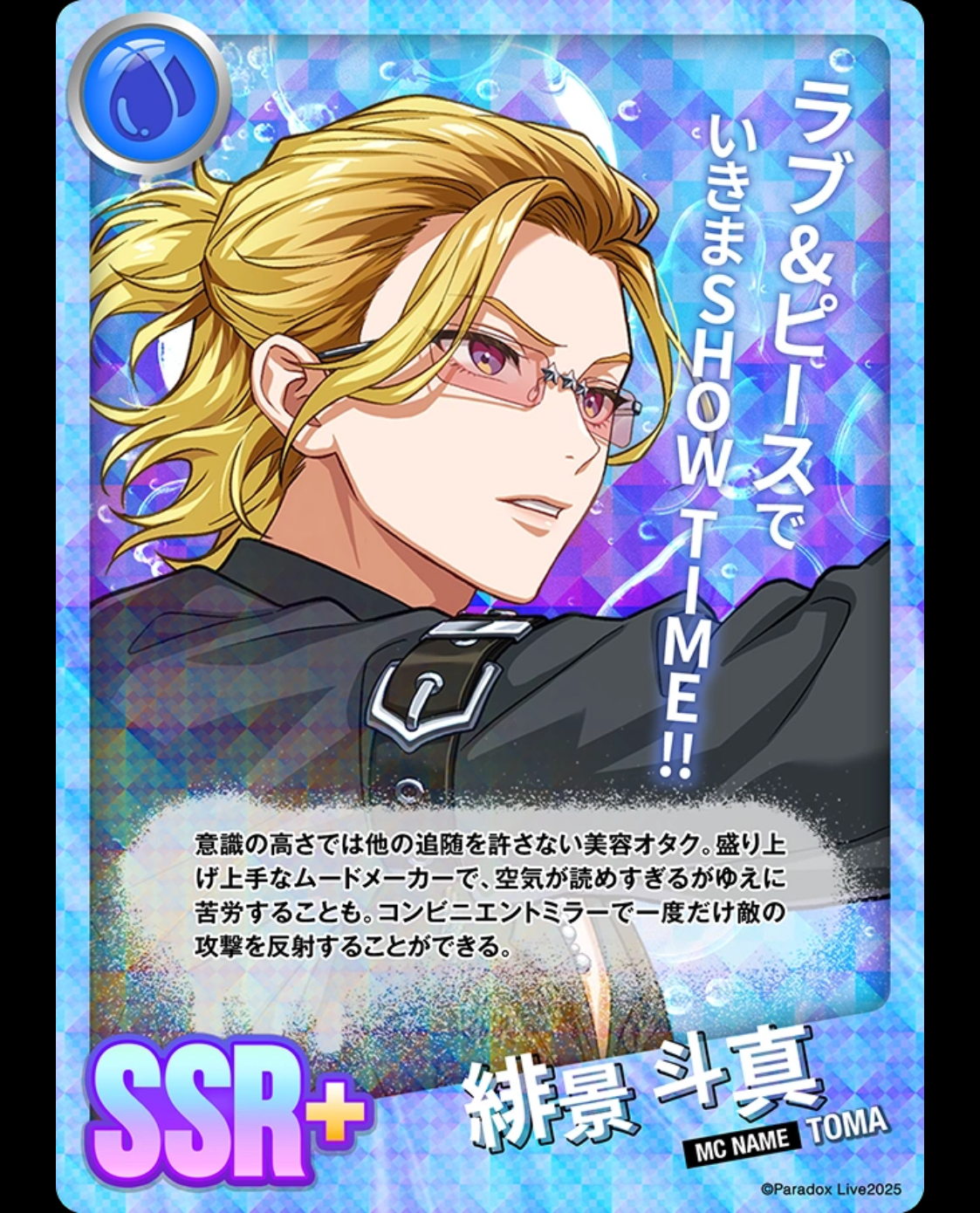 자기 관리에 있어서는 타의 추종을 불허하는 미용 오타쿠. 분위기를 잘 띄우는 분위기 메이커지만, 눈치가 빠르기 때문에 고생하는 일도 있다. 편리한 거울로 한 번 적의 공격을 반사할 수 있다.