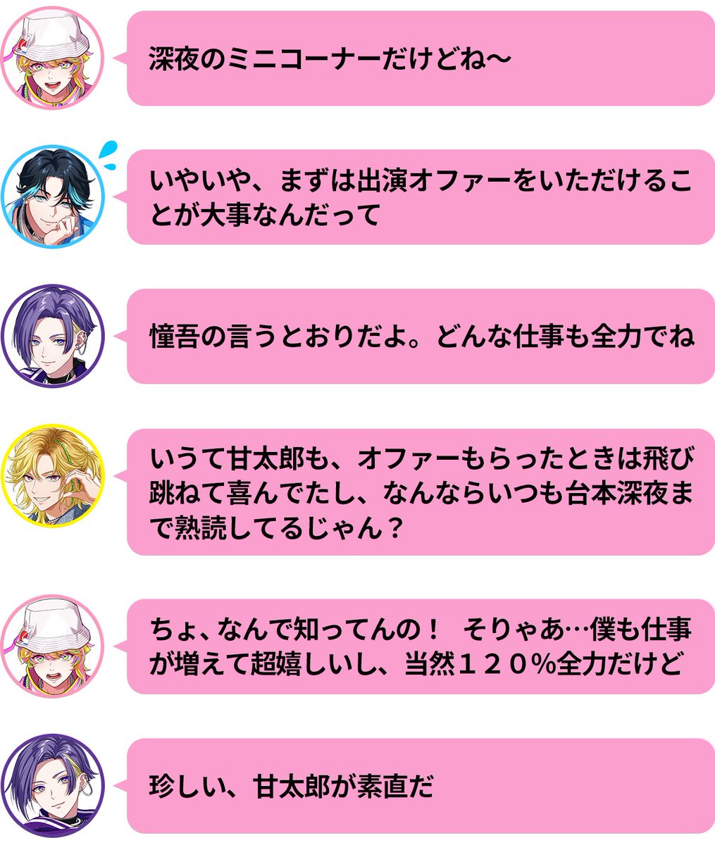 토마: 그렇다고 해도 칸타로도, 제안을 받았을 때는 펄쩍 뛰면서 기뻐했고, 오히려 언제나 밤까지 대본 읽었잖아?